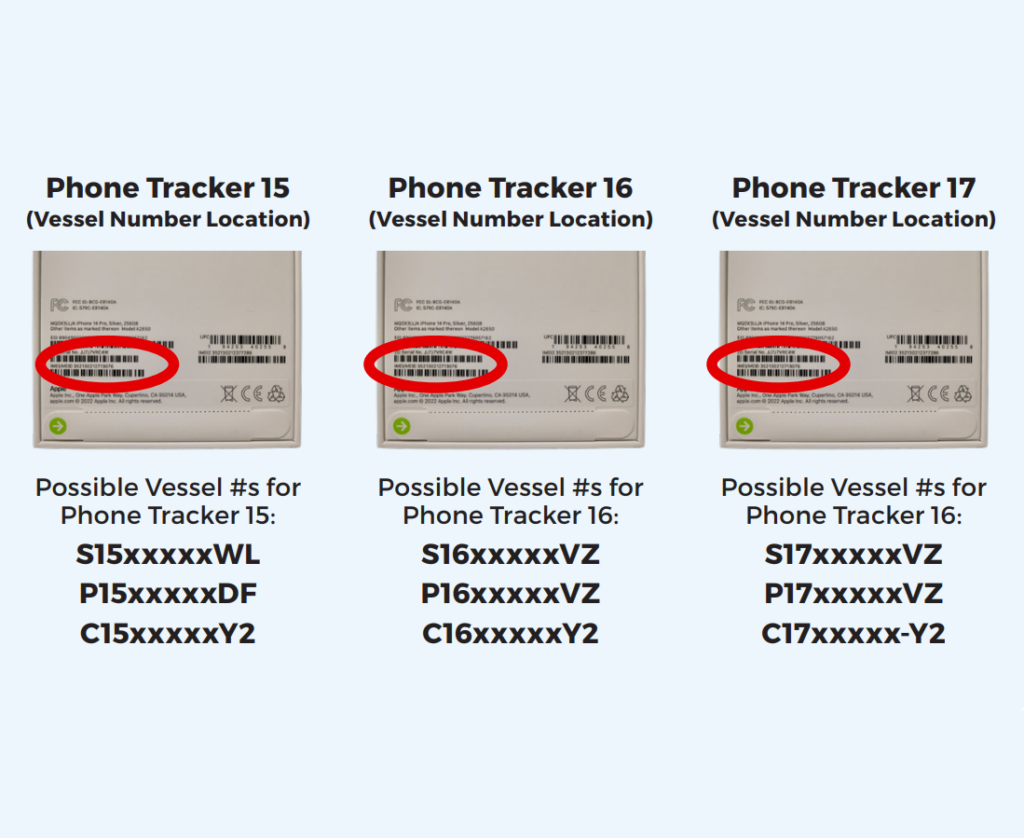 Phone Tracker has an assigned Vessel Number. The Vessel Number is displayed on the back of the Tracker, circled to the right.
