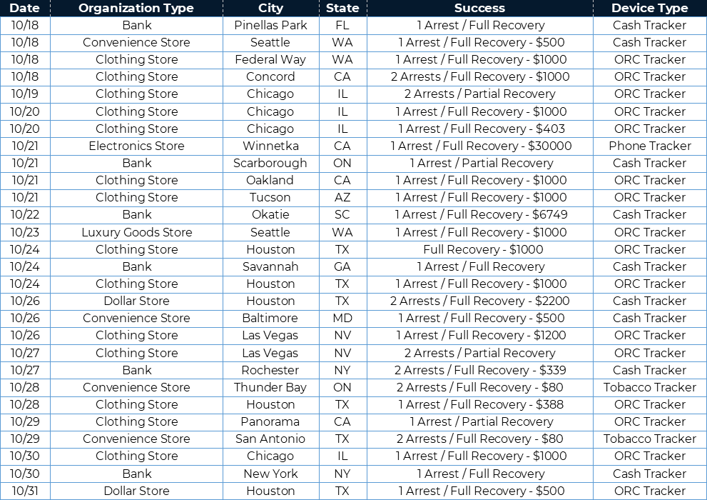 Following a robbery, Pueblo PD located the suspect vehicle within two minutes of receiving the tracker’s location from 3Si’s DirectToDispatch Portal. A highspeed chase ensued, and two out of three suspects were arrested at the scene, and all the stolen cash and the drawer were recovered from the vehicle. Detectives praised the 3Si technology for providing the situational awareness that helped them respond immediately and with precision.