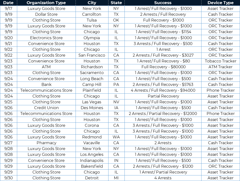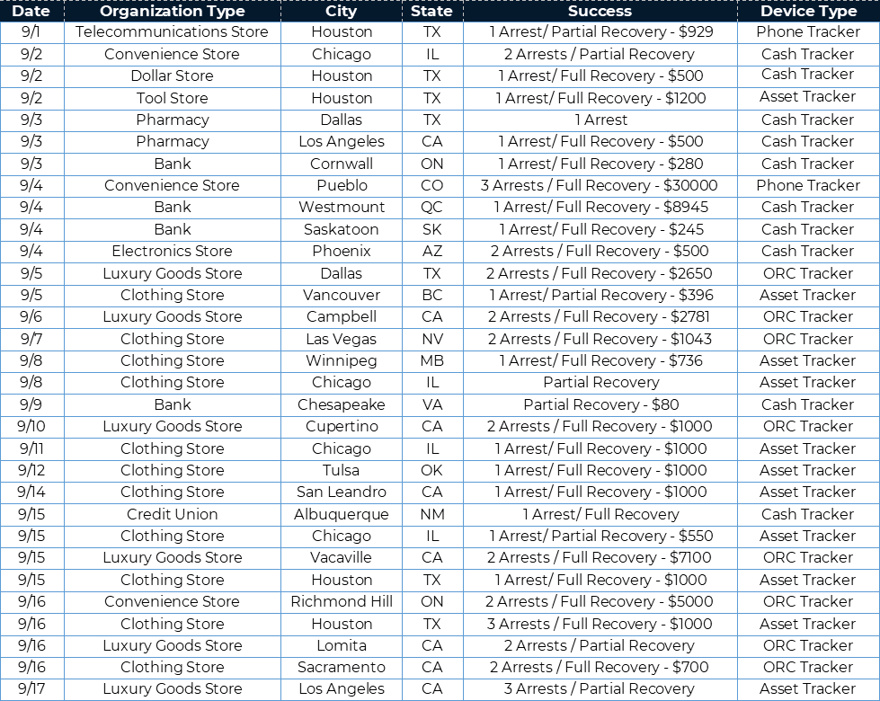 Two people committed coordinated thefts at several retail locations in the region, stealing high-end personal care products. Two 3Si ORC Trackers were triggered, allowing officers to intercept the suspects in their vehicle and recover roughly $5,000 in merchandise. The investigating officer stated the arrests were a direct result of the tracking data, noting they were highly impressed with the technology.
